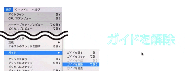 また一括でガイドを消したい場合は、メニューから[表示]>[ガイド]>[ガイドを消去]を選択します。