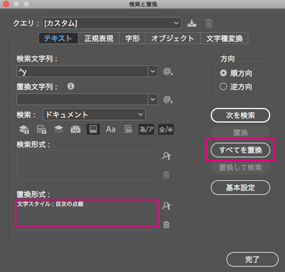 [置換形式の設定]ダイアログが開くので、[文字スタイル]のプルダウンメニューから、先ほど作った「目次の点線」を選択してOKをクリックします。